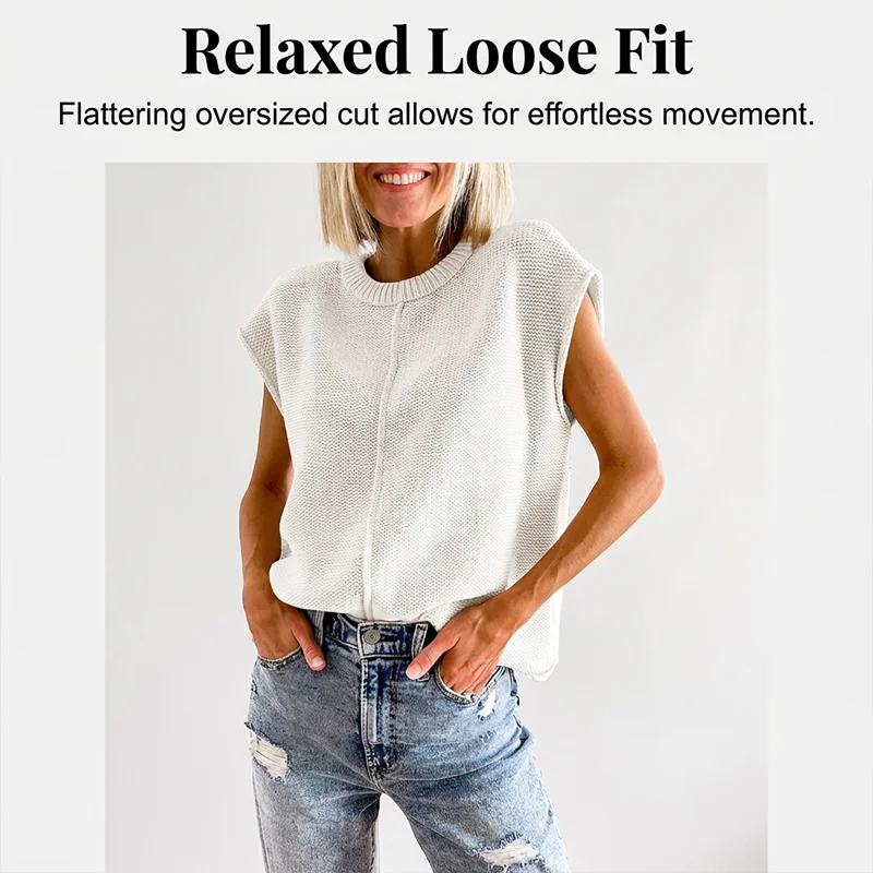 DESIGN CHIC SENZA MANICHE - Accogli l'inizio dell'autunno con questo gilet chic in maglia senza maniche. La sua silhouette morbida offre un'estetica rilassata e moderna, perfetta per qualsiasi uscita informale.